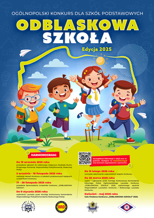 „Odblaskowa Szkoła” 2025 - to konkurs koordynowany przez Biuro Ruchu Drogowego Komendy Głównej Policji. Celem inicjatywy jest m.in. popularyzowanie wiedzy o bezpieczeństwie w ruchu drogowym, w tym do noszenia odblasków. Dyrektorzy szkół podstawowych, którzy wyrażą chęć przystąpienia do Konkursu, mogą przesyłać zgłoszenia do 19 września 2025 roku.